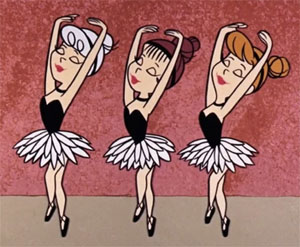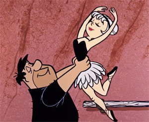 Fred is quickly signed up for the style of dance most akin to bowling rhythms – ballet. Fred appears in black tights before an all-girl classroom of promising students, and a portly female Russian-accented instructor. The girls get the giggles observing Fred, who can’t even limber up his leg on a wall bar without getting it stuck in extended position in a muscle cramp. Fred mysteriously returns home in such condition, claiming to Wilma that he just happens to feel like going around hopping on one foot. Things get more mysterious, as Fred keeps calling in sick to work, yet either disappears from the house, or holes up in the basement, observed through the window by the girls in the act of spinning and prancing on his tiptoes. To rule out that another woman is involved, Betty volunteers Barney to shadow Fred the next time Fred leaves the house. Barney trails him to the dance studio, and finds not just another woman, but ten of them watching Fred spinning and leaping in his tights. The girls meet up with Barney upon receiving his phone call, and Wilma enters the studio. Fred doesn’t even recognize her, sending her into a twirling spin as if one of his classmates – but finally does a double-take, and collapses to the floor in a clumsy fall. Wilma gives him two minutes to get out of that black underwear and come home.