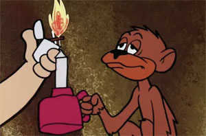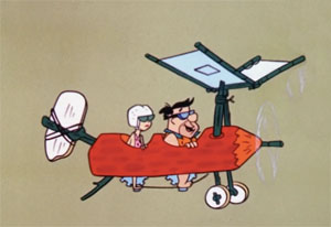 Knowing the girls won’t sit for two cancellations of the picnic in a row, Fred and Barney take the family on their picnic outing – at the airport. Carefully plotting their timing, the boys calculate a spare fifteen minutes while the girls cook and the kids are occupied with Hoppy, in which the boys will never be missed, and Fred can complete his solo. The control tower sarcastically clears Fred for takeoff on five runways at once, and Kitty reminds him to circle the field twice and land, but stay out of restricted military air space nearby. Fred gets the craft up with ease, then finds an unexpected passenger – Barney, in the rear seat, along to help him solo. Fred can use all the help he can get, as a slow dodo bird decides to take a siesta – right on top of the plane’s wing. The plane begins to fall, but Barney reminds Fred to use the acrobatic roll, temporarily dumping the bird off. But the fall has placed the plane way off course, over the restricted air space. A general radios for the unidentified aircraft to identify itself. But Fred doesn’t hear, preoccupied with the fact that the dodo has returned. Barney tries to scare off the bird with a big rock used for the plane’s brake, but accidentally drops the rock overboard, right onto the general’s control center. The general shouts orders to fire on the plane. Three mammoths begin flinging boulders of equal size into the skies. Then, the prehistoric equivalent of an anti-aircraft missile is launched – a streamlined, needle-nosed bird, propelled from a slingshot strung between the necks of two giraffes emerging from a silo. Fred has to take some fancy evasive measures to narrowly miss impact by the bird, but pulls one lever too many, ejecting himself from the plane. Fred at least has the good sense to operate a parachute correctly, and comes in for a soft landing near Wilma and Betty. But Barney is still up in the plane, with no idea how to control it. Fred races for the control tower, grabs the controller’s mike, and manages to talk Barney down, using the mid-air stall to bring the craft down on its tail before running out of runway. Fred doesn’t get his license, but is hailed by Kitty as a hero for talking his friend down. Explanations are made by Kitty to Wilma and Betty of Fred’s aspirations for a new career to make Wilma proud of Fred, but Wilma states she’s proud of Fred as is – something Fred s glad to hear, as he’s decided it’s safer to keep his feet on the ground. The same feeling might not be shared by the kids, however, as Bamm Bamm circles Pebbles with arms outstretched, playing he is a plane, for the fade out.