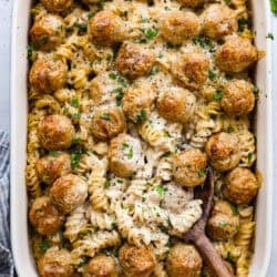 Tender meatballs are layered over perfectly cooked pasta and baked in a rich, creamy gravy in this Swedish Meatball Casserole.