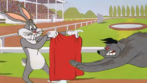 As for what is left of the racers, Bugs gets ahead of them, and jeers a “Nyah Nyah” at them, luring them to chase him off the track through a grandstand exit. Just outside the gates, Bugs spots a taxi waiting for its next rider. Bugs leaps into the cab’s open passenger door, and is immediately followed by the dogs. But Bugs double-crosses them by exiting out the opposite cab door, slamming it shut in the face of his pursuers. As the cab fills to capacity with canines, Bugs shouts directions to the driver: “The Dog Pound. Hurry!” The cab zooms away, removing the mutts from the picture – all except one. The favorite, the one Bugs irritated most, never got on board, and is still determined to sink his teeth into some potential hasenpfeffer. Bugs thus wages a one-on-one war with the remaining dog back on the track, raising the railing to trip him when he re-enters the race track, sending him chasing after a fake balloon rabbit into the sky, and finally getting him to fetch a stick – of lit TNT. All the while, Bugs tries to flirt with the mechanical female each time she whizzes by, pitching his best come-on lines at a pace equal to her speed: “HeyDreamboathow’saboutyouandmemakingbeautifulmusictogether?”