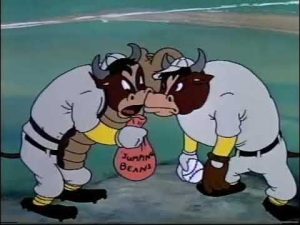 Though it doesn’t play by traditional arena rules, it’s hard to ignore Mexican Baseball (Terrytoons/Fox, Gandy Goose, 3/14/47 – Mannie Davis, dir.), a creative idea where the real-life popularity of the Mexican baseball leagues and cross-over of personnel between such leagues and the U.S. majors is exploited by the Terry writers, through the creation of a new brand of the sport that is as much bullfighting as it is baseball. The two major leaguers lured to play in Mexico are Gandy and Sourpuss, who arrive in an old jalopy at the entrance to a bull ring converted into a baseball stadium. They present themselves as a two-man visiting team, while a Mexican band plays a slightly off-key rendition of “Yankee Doodle”. Then the home team is introduced, as gates across the arena open – releasing a stampede of charging bulls, dressed in baseball uniforms. Gandy and Sourpuss are driven waist-deep into the ground as the bulls charge over them, then watch as the bulls mix it up with tosses of baseballs along the baselines and outfield. Gandy remarks to Sourpuss, “On second thought, I think I’ll go home.” Sourpuss (played in this one cartoon by Paramount regular Sid Raymond), angrily responds. “Listen. You’re in this as deep as I am. I’m gonna see this through, even if it costs me YOUR life!”