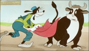 Baggage Buster (Disney/RKO, Goofy, 4/18/41 – Jack Kinney, dir.) – Goofy is station-master and baggage handler at a rural railroad station. He receives a telegraph message that a magician’s trunk must be loaded on the next departing train. Before the train arrives, Goofy attempts to place the heavy black trunk in position upon the platform for pick-up. Easier said than done. The trunk itself is full of tricks, including a detaching carrying handle, self-levitation, and a built in saw-the-lady in half trick. Worse yet are the trunk’s contents, which include a magic hat and cape concealing a veritable menagerie of live animals. The hat produces birds and bunnies, a half-dozen or more at a time. When Goofy removes the cape from the trunk and allows it to fall upon the platform, it begins to rise of its own power, revealing under its fabric the hooves and torso of a massive bull. The bull’s design and initial mannerisms lead one to believe he is some kind of a twin cousin to Ferdinand, as he lays a slurping kiss upon Goofy’s face when Goofy peers under one edge of the cape. But Goofy will have no part in this nonsense, and takes hold of the cape, waving it at the bull to shoo him away. Wouldn’t you know it, Goofy chooses to present the cape with the inner lining-side out, displaying a waving pennant of red. The view of this sight changes the disposition of the bull from lovable and harmless to fierce and peeved. He begins to paw the wood of the platform, readying himself for a charge. Goofy becomes aware of his error in color choice, and begins to meekly wiggle the cape in an embarrassed, apologetic manner, as if to say, “I really didn’t mean to. It was all in fun.” Too late to change the bull’s mind. He charges Goofy at full speed, and the Goof ducks his head behind the extended cape, not having the sense to attempt a bullfighter’s pass, but helplessly believing the cape will provide some sort of barrier to the imminent impact. Oddly, his dim-wit instinct to merely duck turns out to be the proper move, as a collision with the bull’s horns never occurs. Instead, the bull is magically swallowed up into the fabric of the cape, disappearing back to from whence he came.