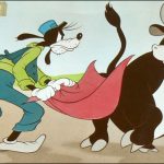 Goofy continues to be confused, shaking the cape out in attempt to determine where the bull went. Instead of the bull again, Goofy produces from the cape a boxing kangaroo! Things continue to escalate and get out of hand, until Goofy tries to dispose of the cape altogether by tossing it away. Just his luck, his random throw lands the cape caught between the blades of a rotating electric fan at his station house, and the whirling cape dispenses an entire zoo of animals (some even appearing to be weird mutants of more than one species at once). Goofy spends at least the last minute or more of the film rounding up the stampede before the train arrives, stuffing and compressing all the animals (even an elephant) back into the trunk and locking it tight. With his baggage cart, he wheels the trunk up to the open door of one of the train’s box cars, and gives it a mighty shove, rolling it end-over-end through the doorway. He fails to notice that the door on the other side of the car is also open, and the trunk merely rolls through the second doorway and off the train again, its lid springing open. When the train pulls away, Goofy stares in shock, at another menagerie even larger than the first, staring at him from across the tracks. Goofy ends the film by running down the tracks after the fast-departing train shouting a line which fades in volume by the last line. I believe the stated line is “Hey, come back! You forgot sump’tin’!” It might have been funnier if he had said “Hey, come back! You forgot ME!”