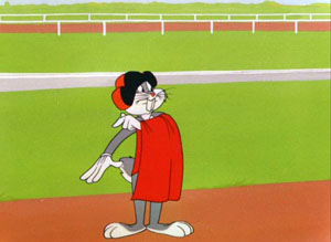 The call to the post draws the dogs onto the track, and Bugs to the railing, not wanting to miss a minute of the action. Bugs is, however, entirely unfamiliar with the customs of the sport, and unaware of how the dogs are encouraged to run at full speed around the track. Out from a small box on the railing, scooting along a track recessed in the rail itself, appears a mechanical rabbit, which in dog racing acts as if the pace car, the dogs trained to chase after it around the track. The fake bunny just happens to have a pretty face and somewhat long eyelashes, suggesting a female. (In real-life tracks, there was no suggestion that the rabbit was a girl, and track announcers commonly referred to the robot by the name of “Swifty”.) “Wow”, thinks Bugs, “What a hunk of feminine pulchritude-ee.” But the sight of all those dogs, chasing one helpless female, raises Bugs ire and more heroic instincts. “Chivalry is not dead! I’ll save ya’, sweetheart”, he shouts. Bugs runs onto the track, prompting the track announcer to remark at the unheard-of sight, “And he’s chasing the dogs!” Bugs lands flying tackles upon many of the contenders, using rodeo-like tactics to hogtie them with their own tails. In one of my favorite shots, he runs along the railing, beating at the dogs below with the greens-end of his carrot, while shouting “Gangway, one side! Let a rabbit through!” The cartoon has the notable distinction of possibly being the last Warner cartoon to feature the suicide line, “Now I’ve seen everything”, but in which the suicide, to my knowledge, has never been cut out of any screening. This is because the line is delivered by the track announcer over the P.A. system. We never see what follows, but the sound of a gunshot is heard through the loudspeakers – and the announcer’s voice is never heard again. Leave the audience to draw their own conclusions.