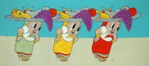 I Eats My Spinach (Fleischer/Paramount, Popeye, 11/17/33 – Dave Feischer, dir., Seymour Kneitel/Roland Crandall, anim.) – One of the earliest Popeye cartoons finds the sailor and Olive attending a rodeo (on one ticket, passed to Popeye by Olive’s big toe over the fence once Olive is already inside). Bluto is of course the main attraction, demonstrating fancy riding and roping, upon a steed that at a crack of a whip can magically divide into three smaller horses, then reassemble again. When Bluto flirts with Olive, Popeye is of course compelled to prove he is the better man, with his own fancy riding and bulldogging exhibitions. A champion bull is released, and Bluto finds him to be more than he can handle. Popeye, however, resorts to toreador techniques, making passes with the bull in classic cape-waving manner. Bluto, unable to top Popeye at the event, turns his attentions to roping Olive from the stands. An interesting four-way chase shot develops, with Olive pursued by Bluto pursued by Popeye pursued by the bull, and everybody playing a game of socking the one behind them (except the bull, who gets knocked down, and holds his aching jaw while saying “Oooh!”) Popeye finally eats his spinach, and knocks Bluto out of contention, but faces the mad charge of the angry bull (using a gag that would be reused over and over in Paramount cartoons, with steam shooting out of the bull’s horns like the whistles of a locomotive). With one mighty sock, Popeye launches the bull skyward, out of frame. When the bull returns to earth, he is already broken up into a wide assortment of fancy cuts, and from nowhere has appeared a butcher’s table, meat cleaver, apron, and chef’s hat for Popeye, topped with an awning over all reading “Meat Market”. This appears to be the original appearance of each of these last two gags. The steam whistle gag would be revisited not only in some of the Paramount cartoons discussed last week, but also in the opening scenes of “The Old Shell Game”. The meat market gag would cross-over into other studios on many occasions, including Woody Woodpecker’s “The Hollywood Matador” and Daffy Duck’s “Mexican Joyride”. It would even appear in a non-bovine setting (the victim being a wild boar) in Mighty Mouse’s “Aladdin’s Lamp”. Paramount itself would reuse the gag in the Technicolor semi-remake of this film, “Rodeo Romeo” (although the remake does not include cape fighting), and also in “Thrill of Fair”. Notably, a home movie edition consisting of a digest of the last half of the Fleischer original chose a retitling spotlighting the closing gang, renaming the film, “The Butcher”.