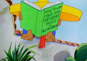 Pancho wants to win a bullfight’s prize to get his Mamacita a washing machine, to save her from hand-scrubbing clothes at water’s edge. He studies the art of bullfighting from a book entitled “How to Win Cows and Influence Bulls” by Dale ConCarnegie. A good 4 minutes of the cartoon have passed before we even enter the arena, wasted mostly on three young girls performing a musical number and periodically teasing Pancho. They eye a poster advertising matador Don Jose at the bullfights – a dead-ringer for Clark Gable. Egotistical Pancho (who was never egotistical in the comics) insists he’s better, and when laughed at, sets out for the bull ring to prove himself. It is amateur day at the arena for unskilled matadors, picadors, swinging doors and cuspidors – but even in this setting, Pancho is not welcome at the door, and is referred to as a “little shrimp”, not a matador. As other contenders enter the arena, the bull is seen off to one side, readying his horns by chalking them up in the manner of a pool cue (a gag often repeated in other films). Calling his impending shot, the bull tells the audience he will sink the 8-ball in the side pocket. He charges the entire squad of would-be matadors, who just happen to be clustered in a triangle like pool balls. The matadors go rolling in all directions around the ring, all but one disappearing behind the upright barriers encircling the perimeter of the arena. The last one hits the arena fence, rolls upwards into the air upon its sides, and flies out of the stadium. Pancho is seated upon the top of a hay wagon, as the ejected matador lands upon the wagon’s tongue.