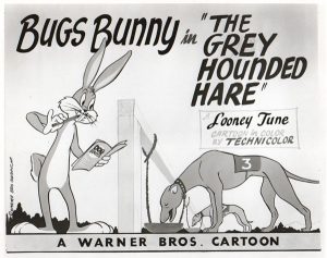 We end this week’s installment with a Robert McKimson classic which unexpectedly falls into this subject category for one of its closing gags. I am glad of it, as it finally gives me a chance to discuss The Grey-Hounded Hare (Warner, Bugs Bunny, 8/6/49), a cartoon which otherwise generally defies categorization along any animation trail. For many years, before my exposure to Columbia cartoons and the full library of Terrytoons shorts, I had thought this film to be the only cartoon ever made on the subject of dog racing – a sport which in my childhood was still popular along the Eastern seaboard. I later learned it was not quite alone, having been pre-dated by Columbia’s Color Rhapsody, “The Greyhound and the Rabbit” (1940), and followed by a short sequence in Terry’s tortoise-and-hare spoof, “A Hare-Breadth Finish” (1957), both also excellent favorites. Though not forgetting a left turn at Albuquerque, Bugs somehow winds up coming out of the ground at a dog racing track. Spotting a discarded program of the contenders in today’s races, Bugs decides to wander into the kennel and give the racers a once-over, presumably before placing a bet. During his inspection, he irritates the favorite of the feature race, who by nature is a rabbit hater – even insisting the dog open his mouth so that Bugs can inspect his teeth. Of course, Bugs finds fault with same, telling the dog he has a shadow around his bicuspidor, and should see his dentist. The dog attempts to lunge at Bugs, but is tethered by a collar and chain fastened around his neck, so can make no forward ground. Instead, his wild clawing of front paws digs himself a hole halfway to China.