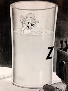 Juke Box Jamboree (7/27/42) – At the Zowie Café, a night spot named after its signature (presumably alcoholic) drink concoction and specializing in South American rhythms, a small mouse can’t get any sleep, thanks to the endless Latin music pouring out of the jukebox. The jukebox operates on the same costly principle as one later seen in Woody Woodpecker’s Real Gone Woody, disposing of played records by hitting them with a hammer, then sweeping the crumbs off the turntable with a whisk broom. The mouse comes out of his mouse hole, enters the jukebox (whose tone arm somehow interchangeably can play discs from both the left and right sides of the center spindle), but can’t get the tone arm off the record, instead himself spinning round and round on the disc. He is thrown out of the machine via the coin slot, and lands in a full glass of Zowie. One taste, and he is hooked, lapping up the glass’s contents down to the last drop – and instantly feeling intoxicated. The remainder of the film is seen as his dream, with ghostly spirits appearing out of bottles matching their dimensions, and forming a Latin band to entertain. Turtles in a pond commence to dancing, while images of senoritas on a lampshade come to life to dance around it – becoming all the more revealing when the mouse turns on the light to reveal the silhouette of their shapes within their wide dancing skirts. The mouse incurs an impact that seems to break him up into dozens of transparent duplicates of himself, who all proceed with him in a conga line back into the mouse hole, where they one-by-one settle back into his mousetrap bed along with him for a good night’s sleep. Songs: A variety of presumably original Latin-themed pieces, mostly instrumental, but one sung in a best attempt at Portuguese by a Carmen Miranda lobster and back-up trio of matchsticks. Nominated for an Academy Award.