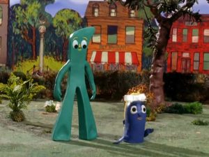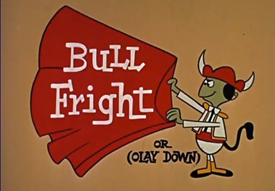 El Toro (Art Clokey, Gumby, circa 1968), suffers from definite pacing problems, trying to draw about an extra minute or more out of material insufficient to fill a short episode’s length. A fleeing crowd draws the attention of Gumby and Goo, shouting “El Toro”. No mention is made of Gumby either living or visiting Spain or Mexico, but there just happens to be a bull arena close by – and the crowd is running in the opposite direction. That can only mean one thing, surmises Goo – the bull is loose. A pair of horns that appear at Gumby’s elbow convince him that Goo is right. Both he and Goo scurry up a tree, taking seats on an overhanging limb. The bull snorts and paces angrily at the foot of the tree, holding them at bay. Prickle happens by, but upon spotting the bull, plays the situation with overconfidence, insisting that you can never show fear to his kind. In fact, Prickle assumes the bull merely wants to play. The bull disproves his theory, stacking one log atop two others, then busting the top log in two with a karate chop from his horns. “That’s a game?”, remarks Gumby. Still, Prickle tries for a game of hide-and-seek with the bull among a yard full of barrels. The bull demolishes all but one of the wooden obstacles, and when Prickle realizes he’s just run out of hiding places, he too shimmies up the tree to join his friends on the limb, referring to the bull as a “sorehead.” Laughter is heard from on the ground, as Pokey approaches, wondering why the gang are up in a tree looking so silly. But his speech turns to a stammer when he sees what drove them up there, and he too gets halfway up the tree trunk. Prickle remarks that he never knew Pokey could climb trees. “I can’t”, responds Pokey, as he begins to slide down the trunk. But one angry snort from the bull sends Pokey into a leap, which propels him into a position clutching onto the branch with his forward hooves. “Well, you’re a fast learner”, observes Prickle. Four on a branch isn’t a recipe for stability, and the branch cracks, depositing all four on the ground within arms’ reach of the bull. But a new voice is heard – that of a matador, who has caught up with the bull from the arena. “Bad bull”, the matador declares, treating the bull like a disobedient child. “You know the rules. There is no fighting outside the arena”. The bull is grounded, and told he will not be allowed to fight in the ring for two weeks, and to get back there immediately. Without a struggle, the bull meekly slips away in compliance with the orders. Prickle declares the bull nothing but a big bully, while Gumby observes that “If that little guy hadn’t horned in, we’d still be up a tree”.