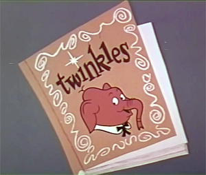 Twinkles and the Bull Fight (Total Television, Twinkles, from episode 3 of “King Leonardo and His Short Subjects” – air date unknown) isn’t much to write home about. This short interstitial, produced for General Mills as a tie in to their cereal with a mini-storybook on the back of the box, basically swipes setup from Disney’s “Mickey’s Rival” (1936). A picnic between Twinkles the magic elephant and Sanford the Parrot, just happening to use a red tablecloth, and set adjacent to the pasture of a mean-tempered bull. Sanford begins to boast that he once was a champion bullfighter, known in Mexico as El Sanfordo. Before Twinkles can get a word in edgewise, Sanford is within the pasture fence, showing off with the tablecloth as a cape. The bull is of course angered and charges, while Sanford gets stage fright and freezes up where he stands, the only thing moving being his knocking knees. Twinkles has to turn to the powers of his magic trunk, reciting the rhyming chant, “Nose, nose, anything goes. Pull that bull up off his toes.” Twinkles trunk transforms into a lariat, and he ropes the bull around the neck, inches shy of his parrot target. Sanford escapes, and Twinkles asks “What happened to El Sanfordo the great matador?” Sanford, unconvincingly, can still throw the bull. “I didn’t have my bullfighting hat on. Otherwise I would have take care of that bull.” Twinkles only smiles.