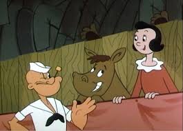 The pen door swings open, while unseen hands pull on a rope to draw out into the area the matador’s opponent. To Olive’s and Popeye’s surprise, it is only the little calf they had seen earlier. This is all the bullying that Popeye can stand. Popeye jumps into the ring, telling Bluto, doesn’t he believe in being kind to dumb animals? Popeye insists Bluto will not fight the little bull – so Bluto fights Popeye instead, using a switchblade sword to cut Popeye’s belt, dropping his pants in front of the crowd to reveal his shorts, then giving Popeye a swift kick in the pants, launching him through the arena wall. A moment later, at the hole made from the impact, a new face appears – a real, full-sized bull who seems to have just happened to be outside, wearing Popeye’s shorts on one horn. Olive has by this time stepped into the ring to take Bluto’s picture, to which Bluto remarks “The pleasure is all yours.” The picture taking is abruptly halted, as both of them observe the new bull charging them. Noting the red of Olive’s standard outfit, Bluto proclaims, “Pardon me. Ladies first”, and picks up Olive bodily, swinging her around as a human cape to avoid the bull’s repeated passes. Popeye returns amidst the zooming blurs of the bull’s repeated charges, quipping “They shouldn’t oughta let them trucks on the highway.” He finally hears Olive’s cries for help, but before he can act, the bull has butted him in the seat of the pants, sending him aloft to land atop a flagpole. Time for the old spinach. From nowhere, a cape appears for the strengthened Popeye to wave, from his position atop the flagpole. The angered bull charges vertically up the pole. We hear an offscreen sock, then Popeye is first to land standing upon the ground at the foot of the pole. “Sometimes ya has to take the bull by the horns”, he tells us, as he suddenly produces a platter and a chef’s hat from nowhere, holds out the plate, and catches as they land five large, king-sized steaks. Bluto smacks his lips at the sight of the feast, and gets his reward – as the five steaks are tossed right in his eyes, followed by a sock from Popeye that sends both bullfighter and steaks flying out of frame. Olive seeks to reward Popeye with a kiss, and Popeye puckers up and closes his eyes. Instead, the little calf pops up between them, and gives Popeye a slurping kiss, then disappears. “Ya sure kisses sweet, Olive”, states a love-struck Popeye, for the fade out.