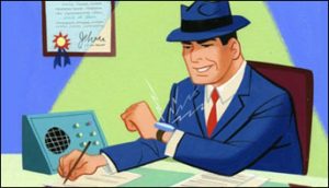 At the ring, BB and the bull put on a reasonably fine show, despite the bull being slow to catch on how BB has rigged the event. BB’s sword is made of rubber, and when he jabs, he orders the bull to take a fall. The bull hams up his part with severe overacting, but finally collapses, as BB stands atop him in triumphant pose. The prize money sack is thrown to him, and he attempts to make a dignified exit. However, he steps on the bull’s tail in the process, reviving the supposedly-dead bovine with a painful “YEE-OWCH!” Even Gomez can easily see this event is not on the up and up. BB starts racing for the exit, and orders the bull to take care of Jitsu, who has jumped into the ring to make an arrest. Using his traditional powers in the art of judo, Joe makes quick work of the bull, grabbing his tail and body slamming him to the ground repeatedly, with intermittent remarks of “So sorry”. One final fling of the bull sends him flying across the arena, to land on BB Eyes, preventing his retreat. Back in the states, Tracy appears to greet the plane carrying Jitsu and his prisoner. But Tracy receives more than one villain to take into custody, as Gomez appears in the plane’s doorway, bringing along the bull in handcuffs. Thus, this episode seems to explain how Go Go Gomez became a part of Tracy’s enforcement squad. The film even ends unusually, with both assistants taking their turns in the iris out, Jitsu first wishing the audience his usual, “Sayonara”, then the hand of Gomez yanking the iris over to his side of the screen, allowing him to wish us, “Adios, I theenk.”