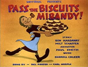 Pass the Biscuits, Mirandy (8/23/43) – Had it not been for affixing a wartime ending to this film, this cartoon might have fit well in TV rotation among Lantz’s other product, and perhaps be remembered alongside such hillbilly epics as Tex Avery’s “A Feud There Was”, Disney’s “The Martins and the Coys”, and the like. Based on a number introduced by Spike Jones, the film initially follows the plot of the song lyric rather closely, and keeps connection with the Jones recording by hiring vocalist Del Porter for the soundtrack, who also sang it on the record. After a hard day of “shootin’ everything [and everyone] in sight”, a hillbilly craves food, and our principal head of household calls for Mirandy’s biscuits, and some gravy to sop ‘em in. Mirandy, who rather closely resembles Mammy Yokum from L’il Abner, prides herself on her buscuits, which won her her man. However, she also prides herself on having no recipe – just throw in the kitchen sink, including glue and chicken feathers to make ‘em light, mix the dough on a washboard, flatten it out in a washing machine wringer, and slap in in an old stove with a spring-release ejector to pop ‘em out when they’re done. For all their renown, the biscuits have one problem – they’re entirely inedible. Chomp down on ‘em, and upper and lower teeth warp in opposite directions. Slap ‘em with an axe, and watch the steel bend. Toss ’em out the window, and knock down the neighbors’ shack. The rival family declares from the rubble, “Mandy’s baking them blockbusters again”, and come a-runnin with their shotguns blazing. Following the song, Mandy’s old man gets the brilliant idea to load all the clan’s rifles with biscuits instead of bullets, to drive the ornery cusses off. In the original song, the idea doesn’t work so well – causing the mountaineer’s gun to explode in his face. Here, however, the biscuits work like a charm, racking up score after score on the rival feuders. The whole fracas is interrupted by someone posting an official war office bulletin on a post nearby, ordering that all families in the area must work or fight. Work? No hillbilly ever heard of it. So both families wind up on the front lines, with Mirandy still supplying the ammunition as a member of the WAAC’s. Hitler, Mussolini, and Tojo make an appearance in a command tank, and are blasted by the baked bombshells, and transformed into a German sausage, a bowl of spaghetti, and a dish of steaming rice. The hillbillies sing in celebration, while the end title asks us to buy more war bonds for victory. There are three known recordings of the song – Spike Jones on Bluebird and on Standard Transcription, and the Merry Macs on Decca – also a quite entertaining version. Spike would also get to perform the number on film, in an unusually gag-laden and highly-entertaining Soundie.