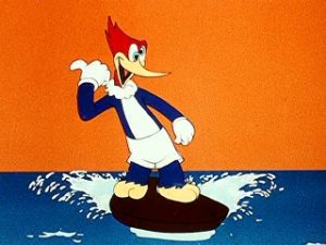 The Beach Nut (10/16/44) returns Lee Sweetland to the mike, here providing Woody with a spirited rendition of “My Bonnie Lies Over the Ocean”, featuring both a line in falsetto, whistling, and colorful runs of octave scales. The film provides a landmark, as the first appearance of Woody’s most durable foil, Wally Walrus, whose peaceful day at the beach is destroyed by Woody’s utter chaos – running him down with a surfboard, setting fire to his beach umbrella, and posing as a fake swami fortune teller at the amusement pier. Wally ties him to an anchor, and tosses it into the sea. However, he forgets to untie the other end of the rope from a weight-supporting post of the pier. The entire pier collapses, dropping Walrus and all members of an onlooking crowd into the drink, just as Woody comes up unharmed. The film closes with everyone dog-paddling to chase Woody out to sea. SONG: “My Bonnie Lies Over the Ocean” The Leake County Revelers performed an early electrical version on Columbia. An anonymous acoustic side also appeared by the “Harmony String Orchestra.” Baritone Stuart Robertson included it in a medley on an HMV Red Seal release with male chorus. Ella Logan performed “My Bonnie…” for Brunswick. Ella Fitzgerald and Glen Gray would each issue Decca sides. Cliff Briner’s Texas Wanderers also waxed a Decca side, giving it the Western Swing style. The Hoosier Hot Shots would issue a Melotone side, making it one of their unique novelty pieces with added comedy repartee. Irv Carroll and his Orchestra issued a Bluebird side, probably in swing style. It received Dixieland treatment on a MacGregor transcription by the Sextette From Hunger. A very old-tyme sounding accordion version appeared by Jimmy Shand’s band on Parlophone. An odd conga-beat version was released in the 50’s by Martinas and His Music for British Columbia. Harry Blons’ Dixieland Band included it on an Audiophile 12″ microgroove hi-fi 78. The Living Guitars tried a rock rendition for RCA in 1964. Freddy Quinn (I cannot determine on what label) performs it absolutely straight and sentimental, as the song was no doubt intended to be heard, on a stereo LP. James Last also plays it fairly straight on a Polydor LP, but adds a little syncopation. Here’s a fun clip with Alvino Rey and his singing guitar: