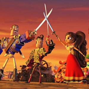 The storyline follows a tale related by a shapely museum curator in an exhibit of Mexican cultural artifacts, penned into the Book of Life, an ever-changing magical volume containing the life stories of every soul, of a legendary wager between La Muerte, a skeletal but alluring female spirit who presides over the festive land of the remembered, and her erstwhile paramour, Xibalba, ruler of the deeper and danker land of the forgotten, where those not remembered go to crumble into dust. (Xibalba may be said to be the only character directly derivative from another studio’s work – but perhaps this is a good thing, as he is almost a “dead” ringer for the entertaining Hades from Disney’s “Hercules”). Xibalba wants out of his present job, and wants to swap realms with La Muerte. He apparently got stuck with his job by losing a previous wager, and, knowing La Muerte’s weakness for a good bet, offers another one. Two random child youths (Juaquin and Manolo) are observed on Earth, both sweet upon the same Senorita (Maria). Each of the gambling spirits chooses a boy as their champion, with the bet to see which one will marry Maria. If Xibalba’s boy (Juaquin) wins, realms are swapped between the spirits. If La Muerte’s Manolo wins, Xibalba agrees to stop meddling in human life forever (his only enjoyable pastime). Of course, Xibalba isn’t above cheating.