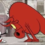 Al Rojo Vivo (translation: “Red Hot”) (Disney, Mickey Mouse Cartoons (TV), 3/27/15 – Dave Wasson, dir.) – A Mickey episode with dialog entirely in Spanish, set in Pamplona, Spain for another running of the bulls. Mickey and Minnie watch on the sidelines, dressed in special white outfits of local design for the occasion – that is, until the wide – er, rear – of Pete looms in front of them to block their view. When Mickey politely asks that Pete step aside, all he receives is a kick in the gut from Pete’s peg leg, landing him in a barrel, and rolling him out into the middle of the street, where he receives a good trampling by a wave of bulls and the members of the crowd running ahead of them. Minnie is hung helplessly by her skirt upon a lamppost, while Pete tries to steal kisses from her. Mickey is peeved, and turns red from head to toe – not a good thing when you are in the middle of a bull run. One of the bulls who has passed him looks over his shoulder, stops, and his eyes turn as red as the color of Mickey’s anatomy. Minnie shouts a warning to Mickey, and the mouse turns white again – this time from fright. The color change is not soon enough to stop the advance of the raging bull, and Mickey flees for his life through the crowd, who parts a wide path for Mickey and the bull to pass.