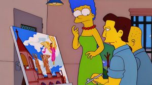The remainder of the show diverts entirely from the subject of bullfighting, splitting into two separate stories. Marge attempts to rehabilitate a prisoner she discovers has natural artistic talent, while Homer attempts to rehabilitate a battered back resulting from the accident. He is referred to a chiropractor who provide only temporary relief, and wants Homer to return for multiple weekly visits over the next three years. Homer discovers a better solution by accidentally falling backwards over the side of a tipped trash can – which instantly sets his vertebrae into proper position. Seeing possibilities in this easy cure, Homer opens his own chiropractic practice, without a license, administering the same treatment to every one of his patients, with miracle results. That is, until two mysterious men express an interest in buying into Homer’s idea, but turn out to be rival chiropractors, who destroy his trash can.