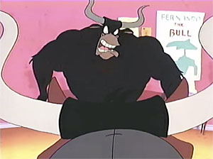 The Pain In Spain (Disney, Timon and Pumbaa, 11/3/95) – In their worldly travels that set the theme for their television series, our heroes wind up in España. A billboard in the countryside advertises an upcoming bullfight in the big city featuring El Toro – a bull so mean, the sign includes a scoreboard to keep track of the number of matadors he has gored. Timon gets into a bragging mode, boasting of what he could do if he were to face Toro himself. To demonstrate, Timon dives into their traveling suitcase and comes up dressed in a matador suit. He asks Pumbaa to use those useless tusks and charge at him. Pumbaa does one better, having just happened to pack in the suitcase for just such an occasion a bull costume to wear. Timon asks Pumbaa to go way back before starting his charge – so far back, that Pumbaa disappears beyond the horizon, and has to call Timon from a pay phone to ask if this is far enough. Pumbaa takes a few paces backwards to rev up his feet motors – and repeats the mistake of Ferdinand, backing into the sharp needles of a cactus. As with his Disney bull predecessor, Pumbaa charges with such force as to mow Timon down, and repeatedly trample him about six or seven times on repeated passes. (Timon sees miniature bull horns circling around his head, like so many tweeting bords.) Also as with Ferdinand, Pumbaa’s moves are observed by two bullfighting scouts, who capture and cart Pumbaa away as the new attraction for the bull ring – news that is not taken well by El Toro, who is given the heave-ho from his employment as nothing but a has-been, and swears revenge.