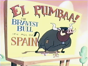 Timon makes a flamboyant entrance into the ring in matador suit, and entertains the crowd with bad stand-up comedy lines about bulls while Pumbaa prepares for his own entrance. But Pumbaa’s entrance will be delayed – by the return of El Toro, who has “beefed” himself up for the event with a crash body-building course to prove he is still the champion. He attempts to dispose of Pumbaa by flushing him down a toilet, then appears in the ring. Timon isn’t quite sure what hit him, and thinks his pal is overacting – until Pumbaa escapes the plumbing and charges in to try to save his friend. Timon goes through the usual delayed reaction at finding himself in the ring with two bulls, and then Timon’s question, “If you’re Pumbaa, then what Pumbaa is THAT Pumbaa?”. The answer is obvious. Our heroes find themselves cornered, and Toro charges from a long distance, allowing for him to engage in transportation changes every time the camera cuts away to view him – from drag racer to diesel truck to streamlined train to Nasa rocket. Pumbaa finally convinces Timon to fight, reminding him of his boasts and that “You’re the brave one.” Timon asks just how he should do it – perform a flamenco dance? This is precisely what he ultimately does, bamboozling the bull similarly to Bugs Bunny’s impromptu dancing in “Bully for Bugs”, while planting snapping mousetraps on his nostrils, smashing clanging cymbals upon his snout, and having Pumbaa blast him in the face with the sour notes of a tuba. Timon backs the bull away from him, using a plunger to prod him instead of a sword, while Pumbaa rolls a cannon up behind the bull, Timon using the plunger end to stuff the bull inside. The cannon is fired, and the toilet plumbing is pushed into the ring, allowing the bull to land in the same predicament in which he had placed Pumbaa. The film quickly comes to a close as our heroes bow before the crowd and are strewn with flowers, Pumbaa shouting, “Ole”.