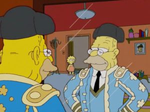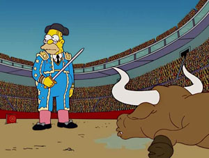 Abe trains in the backyard, using as a bull Bart on a bicycle with a set of horns strapped to the bicycle basket. Abe is too fast for Bart, but Homer is not, and nearly gets speared in the rear while bending over, then turns around to walk right into the horn points, catching him painfully at a key spot between the lower limbs. Lisa, as usual, is completely opposed to the idea – not so much for Grandpa’s safety, but because of the pointless slaughter of helpless bulls. She serenades her pleas for an end to the plan outside the stadium, self-accompanied on Spanish guitar, while the townsfolk merely admire her as cute but ignore altogether her message. Grandpa makes his debut in full matador garb, performs multiple “Veronica” cape passes, and tires the bull out, who lays on the dirt prone and exhausted, while Grandpa, with only momentary hesitancy, follows the crowd’s verdict of “thumbs down” to the bull, and with only the bloodletting kept offscreen, finishes the beast. That night, Grandpa stands admiring himself in the mirror, while Lisa enters, asking him how he could do it. Grandpa explains that for the first time in his life, people were cheering him for what he did, driving him to follow through. Lisa remarks, “I was cheering for you all the time, Grandpa – till now.” As she exits, Grandpa contemplates how she always knows what to say to get to him. At the next bullfight, Grandpa’s performance remains the same as the debut, with the bull again falling to the dirt in exhaustion. But this time, when Grandpa pulls his sword, he tosses it away across the arena, leaving it sticking in the arena fence, then walks to the corrida gates, opening both the main exit and the door holding back all the remaining bulls. Springfield experiences its first-ever running of the bulls, as they stampede down Main Street and everywhere they can find anything red or anyone engaged in selling meat. Only Abe and Lisa rise above the situation, in lawn chairs suspended in mid-air by helium-filled toy balloons. Lisa congratulates Grandpa on turning over a new leaf – but Grandpa’s woes may not be over yet, as two bulls rise into the sky on either side, also suspended by balloons. “Uh oh” moans Grandpa, for an abrupt cut to credits.