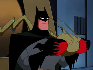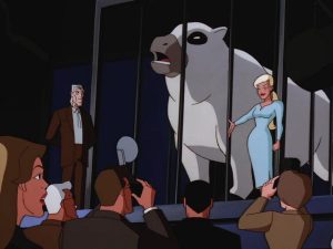 Critters (Warner, Batman, 9/18/98) – One Enoch Brown (affectionately, “Farmer Brown”), an old-timer of country stock who looks and talks like he stepped out of “American Gothic”, but is in reality a highly-skilled biochemist, puts on a presentation with his attractive young country daughter (whom Bullock later refers to as “Elly Mae” for her resemblance to Donna Douglas of The Beverly Hillbillies) at an agricultural expo. Brown presents his solution to world hunger – growth hormones, which have produced a cattle specimen of proportions worthy to provide a meal to King Kong. The bovine is startled by flash photography in the same manner as the legendary ape, and breaks loose, with Commissioner Gordon and Bruce Wayne present in the front row. Bruce finds the creature chasing him, and pulls down a large red theater curtain, which drapes over the beast’s eyes like a cape, causing him to crash into the wall and stun himself, while Brown administers a sedative to leave him dreaming of green pastures. Gordon praises Bruce for his quick thinking, but Bruce covers for his uncharacteristic bravery, informing the Commissioner that he only pulled down the curtain to try to escape through the window.