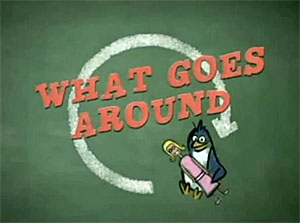 What Goes Around (Dreamworks, The Penguins of Madagascar, 9/19/09) – The Penguins leave the zoo on a secret mission to replace the dolly of a little girl (which they have accidentally caused to be lost down a sewer grating at the zoo). Rico just happens to possess an identical doll as one of his private treasures, and is sweet-talked by Skipper into sacrificing it to prevent the thought of the never-ending weepy-eyes of the little girl. But once the mission is accomplished and the substitute doll left for the little girl to find, the problem remains of returning home cross-town to the zoo – particularly when a psychotic male animal control officer with high-tech capture van spots them on the street, and declaring them strays, says “They’re mine.” (This character may be said to predict the equally determined French female officer who would later appear in Madagascar 3: Europe’s Most Wanted.)
