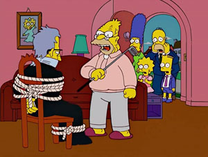 Million Dollar Abie (4/2/06) is another roundabout script that seems to throw together several short and disparate ideas to fill out a half-hour timeslot. Homer sets his mind to spearheading a campaign to bring the NFL’s latest expansion team to Springfield. The campaign works as if by a miracle, and a new stadium is built, the whole town painted in the jersey colors of the soon-to-be Springfield Meltdowns, and all the streets renamed for various football terms and phrases. This renaming disorients the NFL commissioner in finding directions to the stadium to publicly sign the contract, his old road map only showing the street’s old names. He stops at the Simpsons’ house to phone for directions, finding Grandpa Abe to be the only one home who did not go to the stadium. Grandpa becomes mistakenly convinced that the stranger is a hoodlum intending to rob the house and prey on the elderly – so knocks the commissioner out with a blow from a golf club, and keeps him tied and gagged in a chair until late in the evening, when everyone at the stadium has given up waiting and gone home. The family arrives to discover Abe’s blunder, and release the commissioner, only to hear him swear that he will never return to this crazy town – and neither will the expansion team.