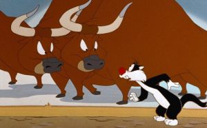 Very few gags instill any life into this lame venture. One decent laugh is the museum curator’s telephone call from a restroom phone to “The World’s Greatest Detective”, a caricature of Sam Spade who is too busy playing tiddly winks with pennies to respond to the call for help. So instead, the curator takes note of graffiti on the restroom tile, one providing a telephone number and reading, “For a good detective, call Granny.” Granny somehow arrives in Spain via a second-hand rocket car, which jets them there in record time, but continues to sputter with knocks and pings after the ignition key is turned off, Granny remarking that it’ll stop – eventually. Of course, upon escaping from Granny’s runaway hotel room, Sylvester winds up with a red blanket, and an alarm clock ready to go off, waking the bulls from exhausted slumber for another day of chasing Sylvester. The bulls ultimately charge through the locked door of the bull ring in seeking out Sylvester, and Tweety and Hector provide Sylvester with a red jogging suit, ensuring that the running will continue round and round the arena ad infinitum.