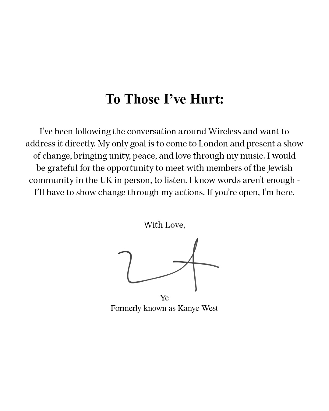 “I’ve been following the conversation around Wireless and want to address it directly,” West wrote. “My only goal is to come to London and present a show of change, bringing unity, peace, and love through music.