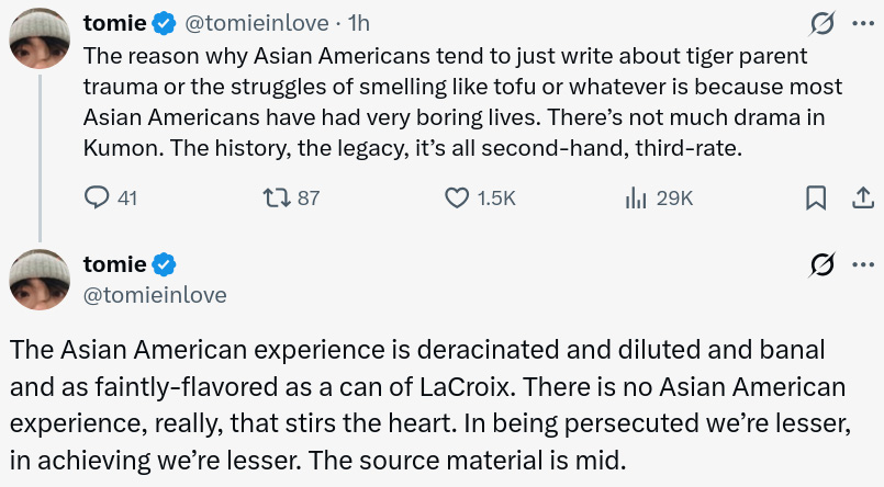 Apparently rehashing the Joy Luck Club seems to a such common thing amongst Asian American authors, that ppl meme on the cliches. I suspect it might be a case of many of them being imaginationless people with no interior monologue and/or unable to picture things in their head (eg not even like an apple).