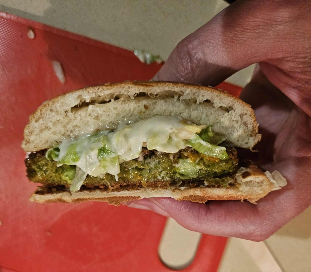 Unlike some of the newer plant-based meat alternatives like the McPlant, the McVeggie uses a classic vegetable patty — not imitation meat. When you cut into it, you can actually see bits of carrots, peas, corn, and other vegetables.