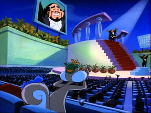 Once inside, the conductor of the symphony orchestra underscoring the event prepares to play the National Anthem, but is briefly disturbed by a handshake from Yakko Warner and a kiss from Dot, delivered in silhouette in the manner of Mickey Mouse’s handshake with Stokowski in “Fantasia”. One line before the Anthem is over, over-anxious Slappy yells out, “Play ball!”, and gets shushed by the crowd. Then onto the stage come the tenors. Slappy suspects they are umpires, but can’t figure out the reason for their breaking into song. Skippy soon begins to think she must be wrong, and Slappy takes a closer look, particularly at the portly equivalent of Pavarotti – and realizes her mistake. “That’s Tommy Lasorda”, she exclaims. She playfully shouts out. “Hey, Tommy! Better get back on the Slim-Fast. You’re losing the war”, and also tells him to shave that beard. The singing continues, with the crowd in the stands standing to applaud each time one of the singers completes a short passage. “Up, down, up, down”, complains Slappy. “What is this, a Jane Fonda workout?” The singing continues, with a lyric to the “Dance of the Hours” consisting entirely of the names of Italian food. Slappy finds this pre-game show to be lasting an eternity. Getting hungry, she scans the aisles for a peanut vendor, but can find none. “Peanuts!” she repeatedly shouts, each time louder and louder, until the Pavarotti clone can barely sing above it. “Solo Mio! Somebody getta her some peanuts”, he shouts. Suddenly, Slappy and Skippy are deluged in a mountain of peanuts from nowhere, and respond, “That’s more like it.”