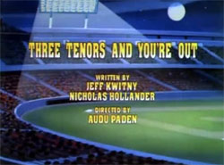 Three Tenors and Your Out (Warner/Spielberg, Slappy Squirrel (from Animaniacs) – 9/16/95) – Slappy has been promising Skippy to take him to a Dodger game all summer, and Skippy is ready to eat Dodger Dogs until he barfs. Wouldn’t you know, Slappy would choose a night when the Dodgers aren’t playing, and the event at the stadium is instead a celebrated concert event of the past – the renown appearances together of the world’s most acclaimed opera singers, “The Three Tenors” (Pavarotti, Carreras, and Domingo, each parodied in names close to their own within the cartoon.) Seeing their faces displayed on a banner over the stadium entrance, Skippy asks, “Who are these guys?” Slappy speculates that they are the new infield for the Montreal Expos.