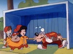 The boys feign a freak fielding accident, pretending they will be out of commission for the season – maybe two or more. But Pete promises to cure PJ’s ailment with his special liniment, while Goofy claims he can cure Max twice as fast with his special stretching exercise regimen. Both boys get the works, and have no choice but to claim they’ve made a miracle recovery. The boys, however, make a discovery in enduring the sounds of Goofy’s and Pete’s over-the-fence bickering. Both the fathers had been on the same little-league team (something PJ compares to a dog being teammates with his fleas), and each blames the other for losing a championship game (Pete, former catcher, claiming Goofy got his signals crossed up and threw the wrong pitches, and Goofy claiming it was Pete that got them mixed-op). The end result was that they finished out their little league days with Pete as water boy and Goofy as bat boy. So neither is the all-pro they have claimed to be. This news comes as little consolation, when the fathers disclose that their old little league coach is still coaching to this day, and tryouts for the league are tomorrow – something both fathers have been lining up their sons to engage in all the time of their training.