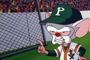 Brain first tries a pep talj to the team, falling back on every old cliche phrase he can think of, but substituting ponderous words in place of common ones (”It hasn’t concluded until there is closure.” “When the going gets tough, the tough get more committed to their ultimate objective.”) His talking leaves the team members saying, “Huh?”, and instead of respect, Brain winds up stuck in wads of the players’ discarded chewing gum as they step from the dugout. Announcer Van Spooney (a fairly poor voice impersonation of Vin Scully) promotes Farmer Ron pork fat pineapple dogs during the broadcast. Brain comes to bat, bit is pounded head-on by the ball as a hit batter. Nobody seems to notice where Brain is, as a pinch runner is sent in for him. Brain himself is stuck to the ball, and gets squeezed around in the pitcher’s mitt, then let fly with the ball at the next batter. The batter connects, down the third base line. Just before reaching third, the ball and Brain disconnect from one another, and the baseman catches Brain in his mitt, while the ball bounces into left field. The baseman tries to get an out at home, tossing quickly with a throw the umpire at first calls as an out – but the voice of Brain is heard from the catcher’s mitt: “I AM NOT A BALL!” The runner is called safe, and the Pineapples win their first game, on what the announcer calls “a real sacrifice play” by LaBraina. In another parody of the Disneyland “What are you going to do now?” commercials, Brain responds to said question from the press, “I’m going to the emergency room.”