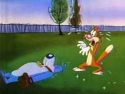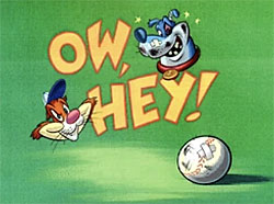 Our heroes relax on a summer day in the backyard, until Meat (the dog) suggests they get some exercise by batting around the old baseball. Shnookums rummages in an old storage chest for baseball supplies (the animators trying for an Avery gag by having him toss out from the chest virtually everything but baseball stuff), then the two finally settle into play mode, with Meat choosing to catch while Shnookums hits flies. The one problem is, every time Meat claims he’s ready to catch Shnookums’ best shot, he gets brained in the head in one way or another. (Ball leaves crater in his eye socket – bounces off center of cranium – scrunches inward his nose – hits on back of his head, driving loose neck skin forward over his snout – knocks his head a full foot to the right of his neck joint – hits him from the rear again, bugging his eyes out – etc.) Meat frequently responds with a shout of “Ow, Hey!” (hence, the title of the episode). While Shnookums continues to ask if Meat is okay, Meat remains a stubborn glutton for punishment, insisting he’s ready now for the next one from Shnookums’ bat. Shnookums finally decides to show Meat a little mercy, and instead of swinging, gently bunts a ball Meat’s way. In a gag of measured slowness, which again might have benefitted from tighter pacing, the ball takes its long, lazy time in reaching Meat, proceeding in litte baby bounces toward the dog’s waiting mitt. Just before the ball can roll to a stop at the edge of Meat’s glove, a set of sprinkler heads rise from the backyard grass, read to irrigate the lawn on a timer. One rises directly under the baseball, and as the water jets out, again drives the ball straight into Meat’s face for another blow, then rebounds off the dog high into the air, setting it bouncing across town. The ball enters the door of a concert hall, bouncing off the heads of most of the orchestra members on stage (including one noticeable character who laughs in a sound-alike manner to Tex Acery’s own deep hearty laugh in “Hamateur Night”, “The Penguin Parade”, and “The Bear’s Tale”, among others, in a direct homage to the gag king). The ball exits the hall, smashes a few warehouse windows on its way to the docks, and finally bounces into the open muzzle of one of the naval guns on board a battleship. (Always include a battleship or ocean liner when homaging Avery.) The gun turret turns seaward, and the cannon is fired, sending the ball into outer space. It catches upon the curve of a crescent moon, and makes a u-turn back toward Earth, achieving the re-emtry speed of a flaming comet. Meat meanwhile has reached a state of delirium, and is wobbling his way in circles around the yard, talking in total gibberish, when the ball finally makes touch-down, again smack on his head, with the impact of an atomic mushroom cloud.