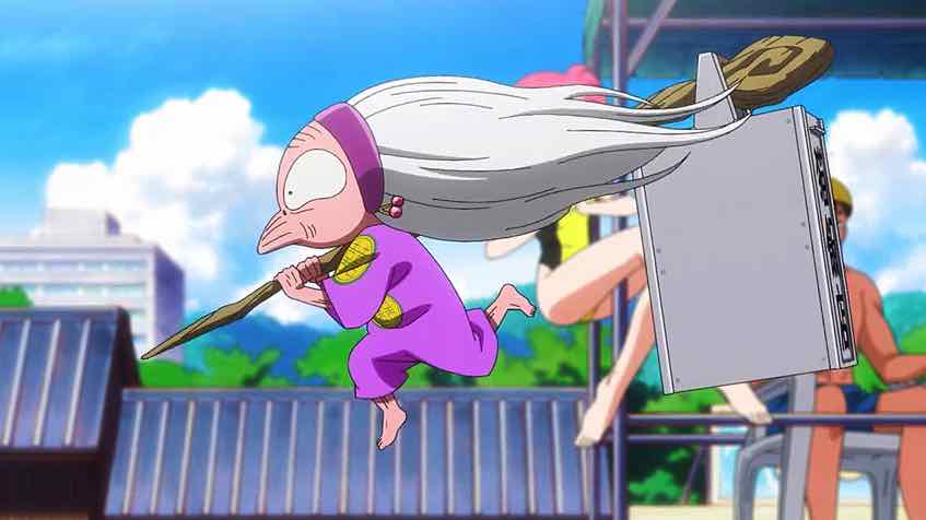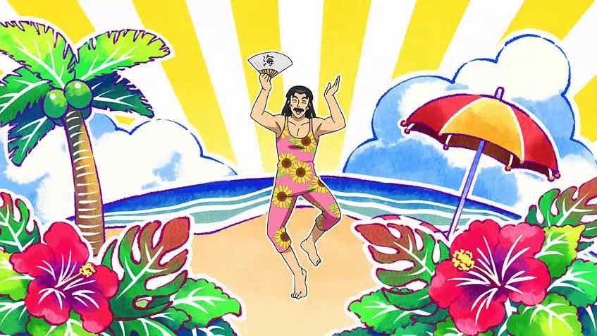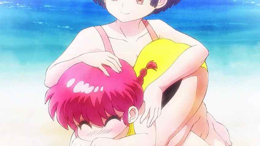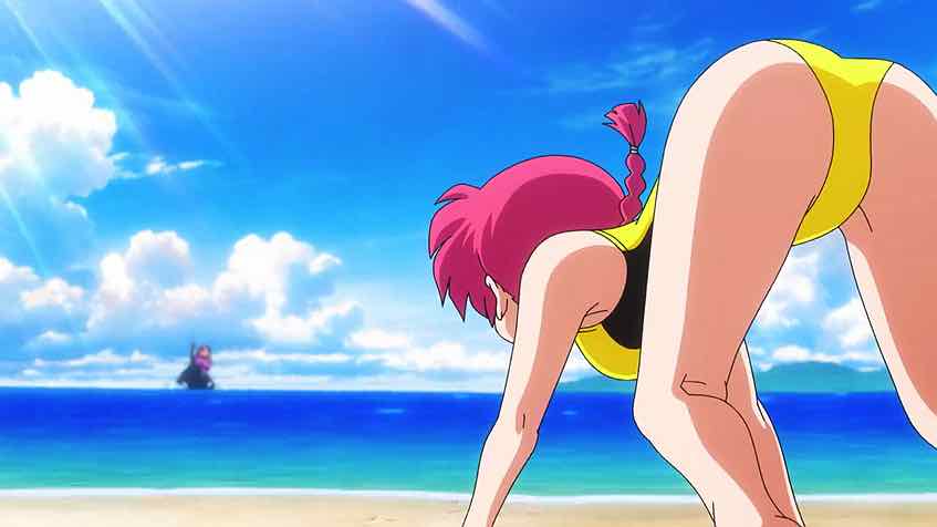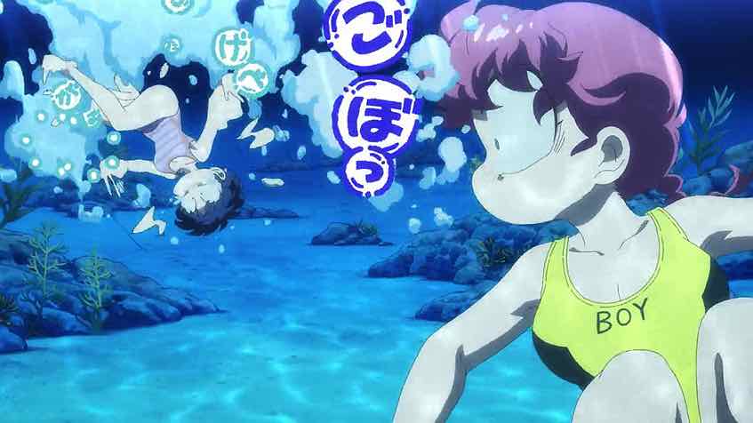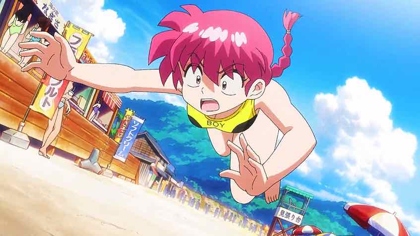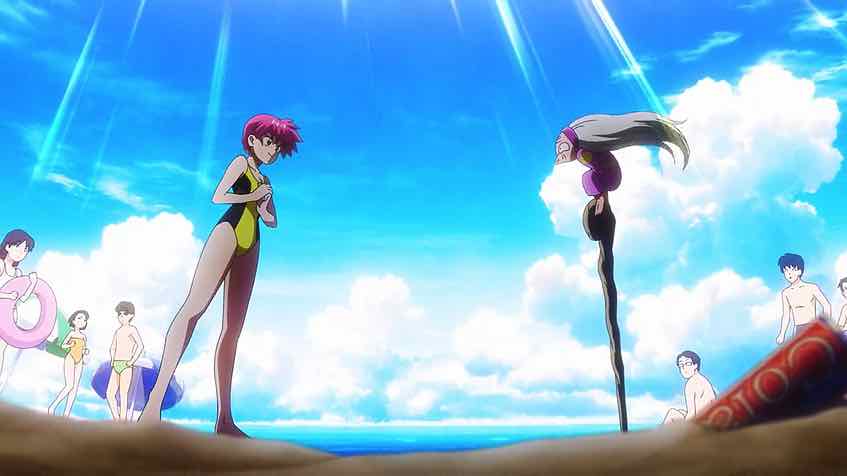 If I have a complaint about this season (apart from Cologne and Mousse being kinda mid for me) it’s that Ryouga has hardly been around. But we got a big dose of Souun and Ichirou this week, in one of the series’ most uproarious episodes yet. It starts with another witty cold open (art gallery) and jumps right to the beach. Ranma is still in hot pursuit of Cologne at the Phoenix Pill, and follows her to the beach cafe where she’s currently hanging out. I don’t remember if this happened in the manga or the ’89, but girl-Ranma wearing a bathing suit that says “Boy” had me in stitches.