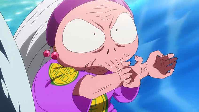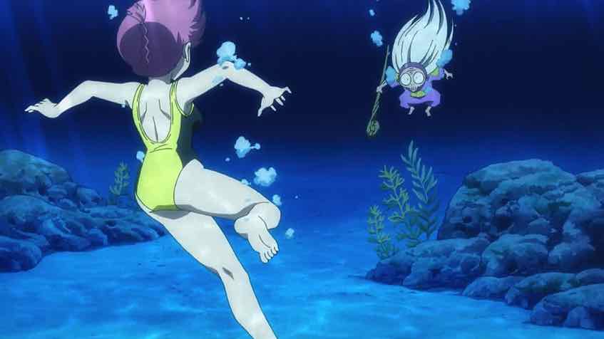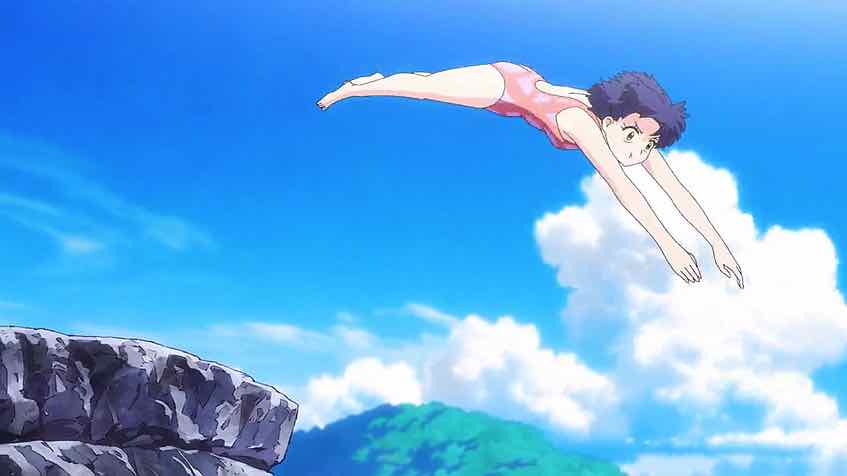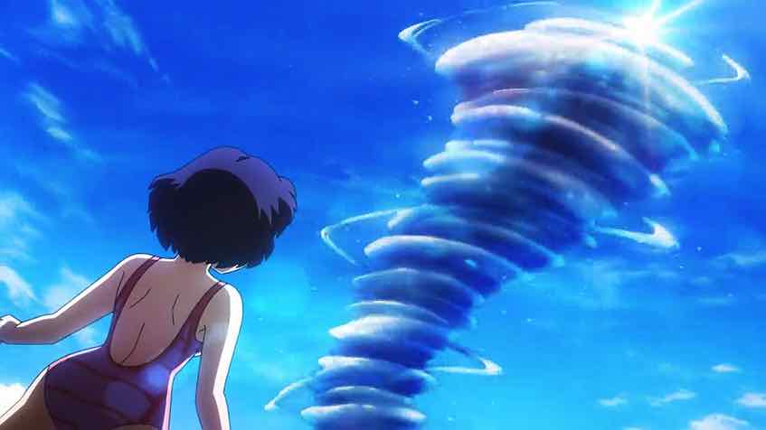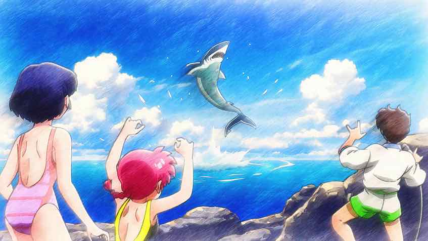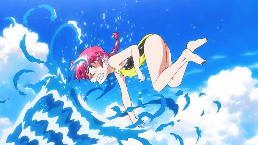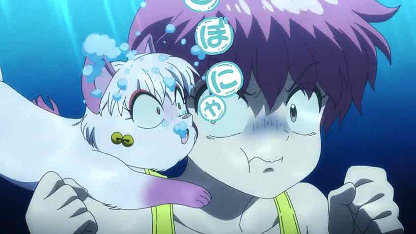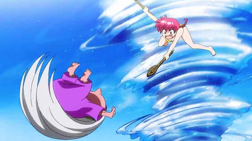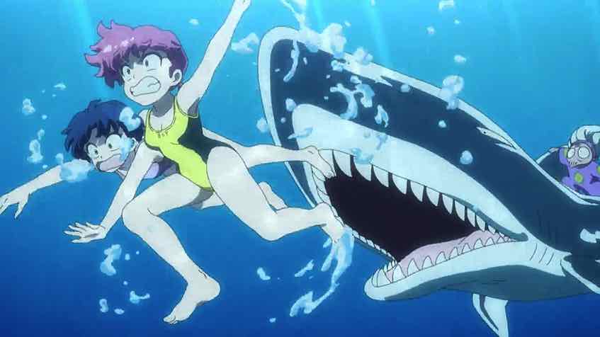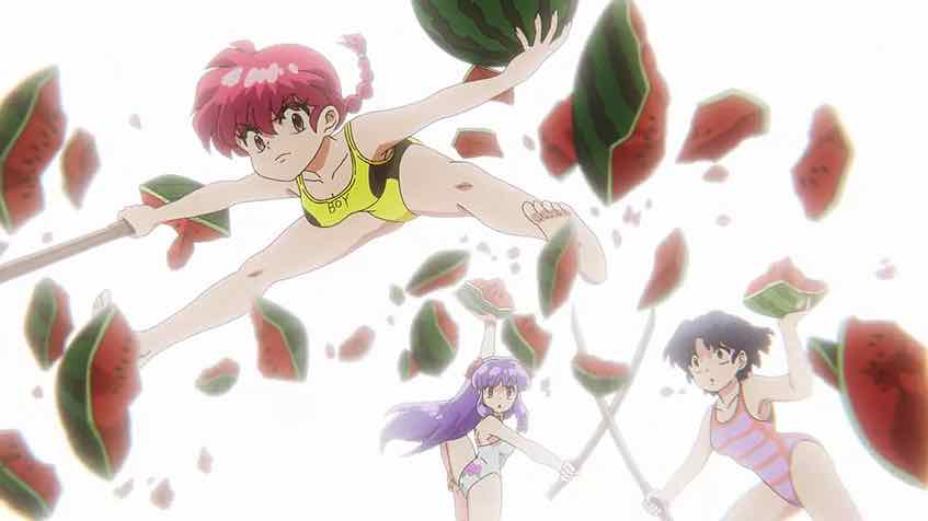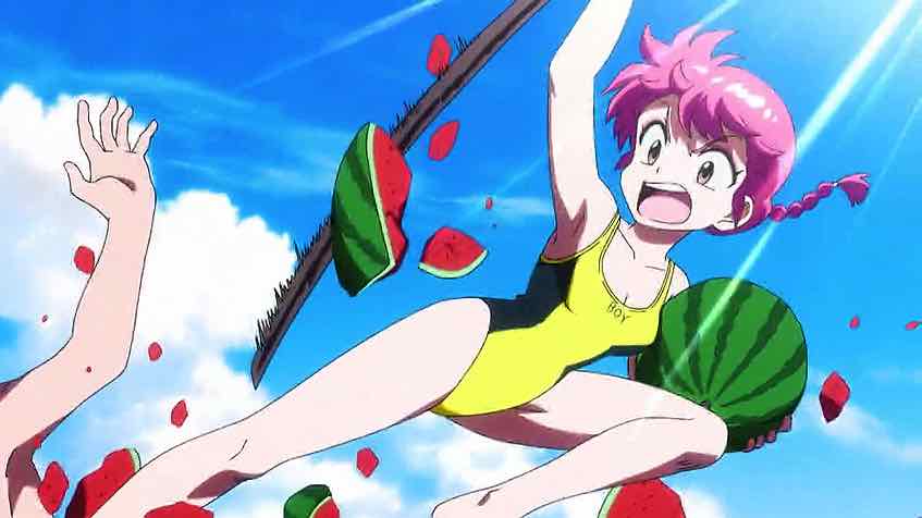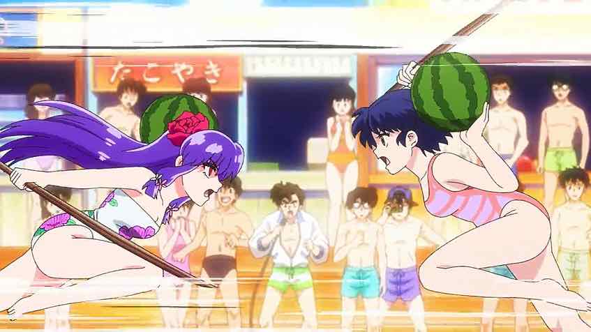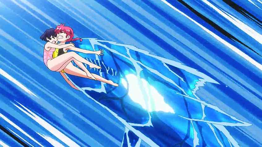 The whole watermelon “race” is classic Ranma ½. It’s utterly stupid in an irresistible way, and peppered through with Tomokazu’s hilarious commentary (calling Cologne a mummy was a personal favorite). Akane, not content to watch Ranma get roughed up by Baba, dives into the water and sinks like a stone. Ranma spits out “Ahou” bubbles and comes to her rescue as Cologne rides in on a shark, and then makes a shark out of water to kick their asses with. Meanwhile Shampoo offers her own unique take on things (Sakuma Rei’s performance is another consistent highlight).